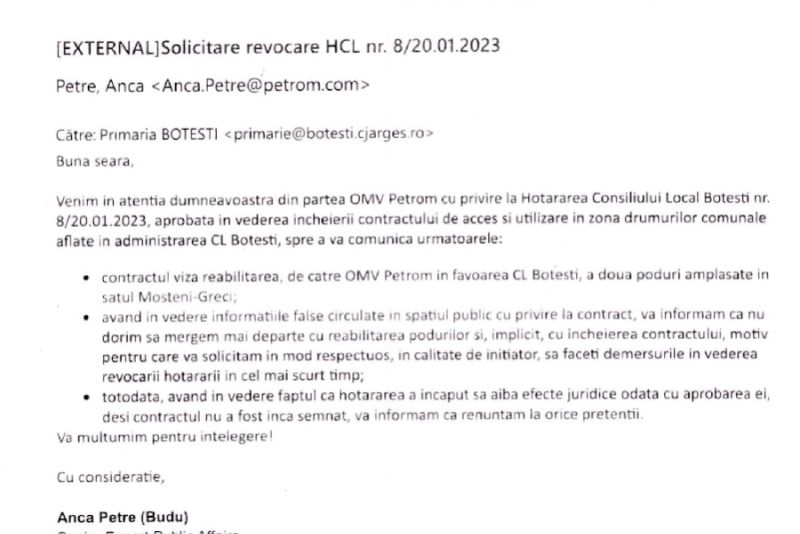 Într-o altă comunicare, OMV Petrom notifică primăria că, în urma "informațiilor false circulate în spațiul public cu privire la contract, vă transmitem că nu mai vrem să mergem înainte cu reabilitatea podurilor (în contul obținerii acordului pentru lucrările solicitate, compania promitea să repare și 2 poduri din zonă - N.R.)".