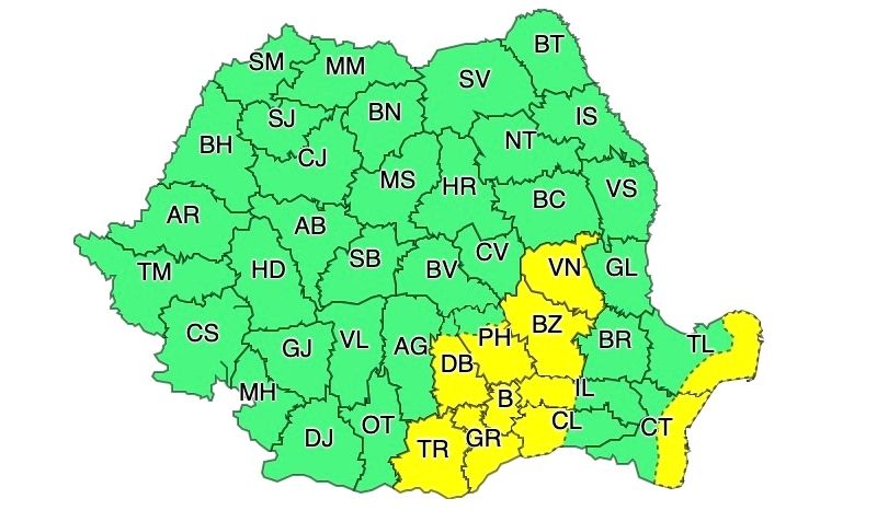 Un nou cod galben de fenomene extreme a fost emis de meteorologi. Potrivit ANM, vântul va sufla cu până la 70 km/h în mai multe județe.