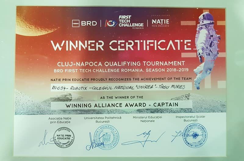 , cea care implementează programul internațional FIRST Tech Challenge în România.Cele 34 de echipe de elevi din România, care s-au întrecut la Cluj provin din orașele: Târgu-Mureș, Alba Iulia, Baia Mare, Beclean, Bistrița, Blaj, Brașov, Cluj-Napoca, Cugir, Dej, Miercurea Ciuc, Năsăud, Oradea, Satu Mare, Sibiu, Ștei, Turda, Zalau și Constanța.RobotiX-CNUnirea Târgu Mureș s-a calificat la Concursul Național de Robotică, ce va avea loc la București, în perioada 21-25 martie.