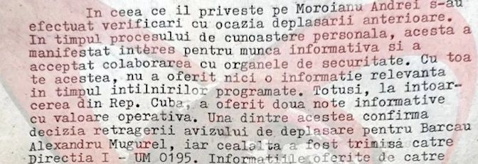 Din el, aflăm că Nicușor Dan fusese recrutat încă din 1987, înaintea olimpiadei de matematică din Cuba, că și-a turnat colegi selectați pentru olimpiada de matematică din Canberra, Australia, 1988, dar și profesorul de liceu, și că manifesta aptitudini reale de turnător, ca și voința de a lucra cu organele.
