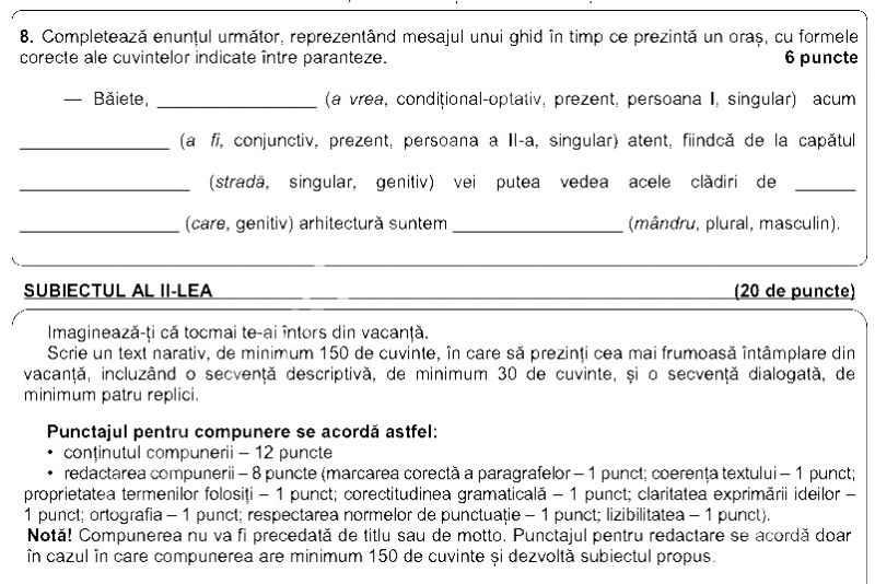 La al doilea subiect de „creație”, cel de la subiectul al II-lea, elevii au primit următoarea cerință: „Imaginează-ți că tocmai te-ai întors din vacanță. Scrie un text narativ, de minimum 150 de cuvinte, în care să prezinți cea mai frumoasă întâmplare din vacanță, incluzând o secvență descriptivă, de minimum 30 de cuvinte, și o secvență dialogată, de minimum patru replici”.