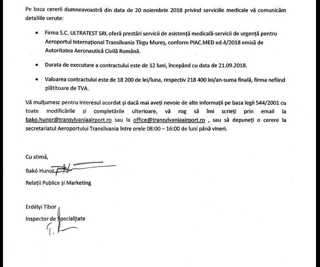 încheiat de aeroportul din subordinea Consiliului Județean Mureș cu firma Ultra Test.