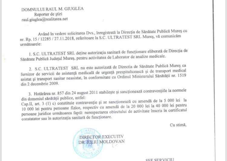 Direcția de Sănătate Publică Mureș arată că „SC ULTRATEST SRL nu este autorizată de Direcția de Sănătate Publică Mureș ca furnizor de servicii de asistență medicală de urgență prespitalicească și de transport medical asistat sau neasistat”.