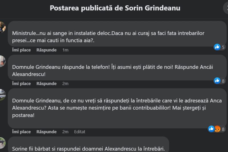 Pagina de Facebook a lui Sorin Grindeanu a fost asaltată de telespectatori ai emisiunii "Culisele Statului ", după ce ministrul Transporturilor sau administratorii profilului său au șters un mesaj în care Anca Alexandrescu i-a cerut să răspundă concret unor întrebări legate de modul în care administrează ministerul, dar și despre situația unor companii din subordine, cum ar fi CFR.