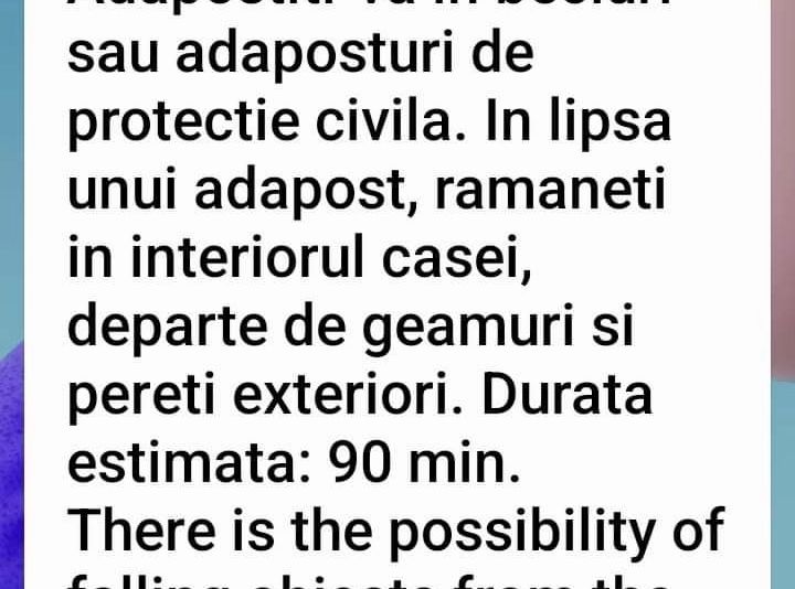 ISU DELTA Tulcea a trimis un mesaj RO-ALERT, prin care avertiza populaţia că există posibilitatea căderii unor obiecte din spaţiul aerian