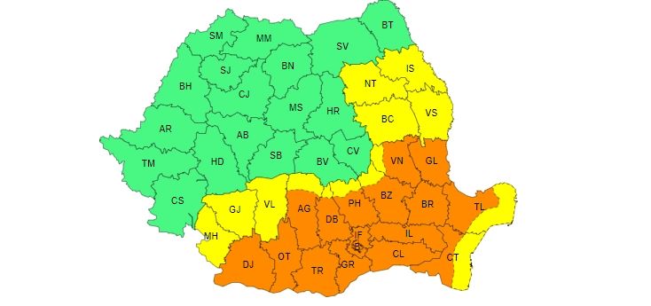 Meteorologii au emis, marți, un Cod portocaliu de caniculă și disconfort termic accentuat. Conform ANM, temperaturi deosebit de ridicate se vor înregistra, până miercuri dimineaţa, în cea mai mare parte a Munteniei, sud-estul Olteniei, partea continentală a Dobrogei şi sudul Moldovei. Totodată, în centrul Moldovei şi nordul Olteniei şi pe litoral va fi și Cod galben de caniculă, valabil din 11 iunie, ora 10.00 și până pe 12 iunie, ora 10.00. În aceste regiuni se vor înregistra temperaturi ridicate pentru această dată, maximele se vor situa între 30 şi 34 de grade.