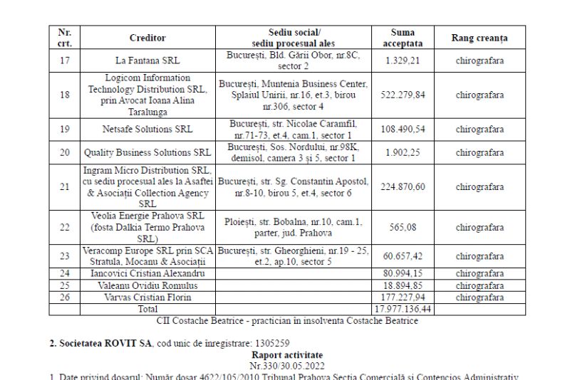 Pe rând, Ghiță datorează bani pentru companiile ASESOFT INTERNATIONAL SA în cuantum de peste 206.200.000 lei, TEAMNET INTERNATIONAL SA în cuantum de peste 442.400.000 lei, INFRATEL NET SRL, în cuantum de peste 17.900.000 lei, 2K TELECOM SRL în cuantum de 395.472.034 lei, TVMP SRL, în cuantum de peste 660.000 lei.