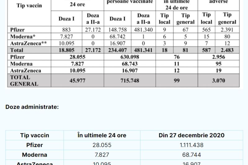 Potrivit unui comunicat de presă publicat, ieri, pe Platforma Națională de Vaccinare anti-Covid, în România s-au înregistrat 3.070 de reacții adverse după vaccinarea anti-Covid, 2.956 dintre ele fiind după vaccinarea cu serul de la Pfizer, 95 după inocularea cu serul de la Moderna și 19 după vaccinarea cu AstraZeneca.