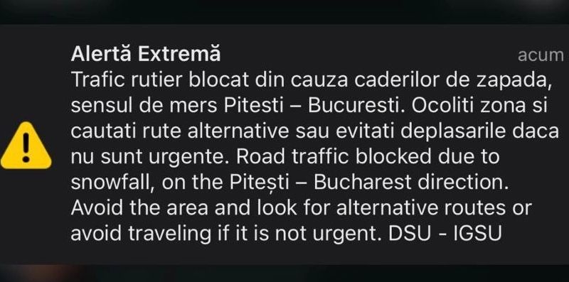 Autoritățile au emis un mesaj RO-ALERT de „alertă extremă” pentru Autostrada A1 București–Pitești, recomandând șoferilor să evite deplasările în zonă și să identifice rute alternative.