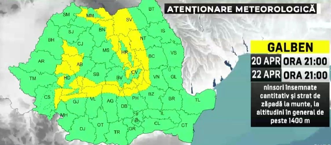 „Menționăm în primul rând avertizarea meteorologică de cod galben valabilă până miercuri seara la ora 21 pentru zona montană, în mod deosebit, acolo unde la altitudini mai mari de 1400 de metri precipitațiile vor fi predominant sub formă de ninsoare.