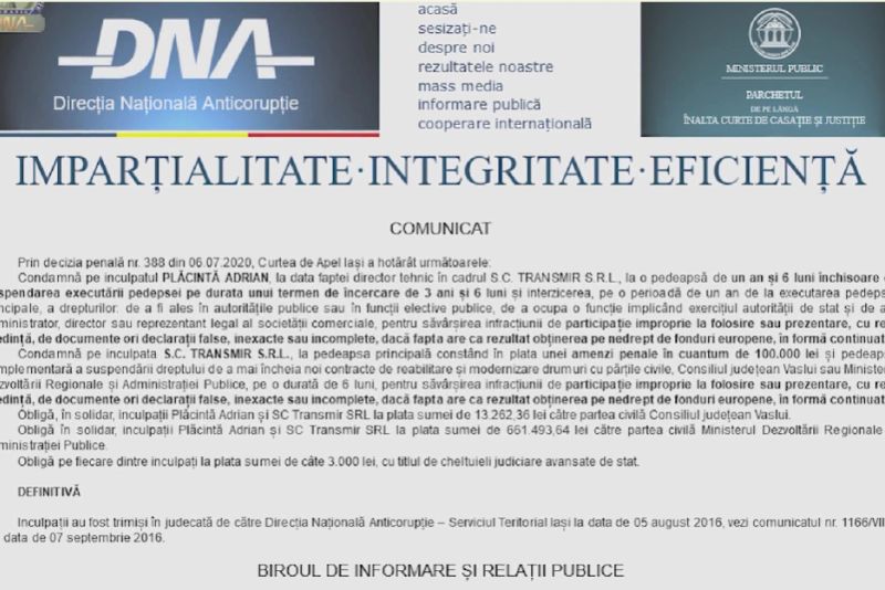 La finalul anchetei, procurorii DNA au dispus trimiterea în judecată atât a directorului tehnic Adrian Plăcintă, cât şi a SC Transmir SRL, ca persoană juridică.