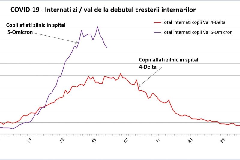 "Vești bune de pe frontul copiilor.Numărul de copii internați zilnic în spitale a început să scadă în această săptămâna față de vârful de duminică (azi 736 față de 911 duminică) și media este deja cu 3.5% sub media săptămânii trecute.Numărul de copii internați la AȚI este de asemenea în scădere.Chiar dacă numărul de minori internați rămâne mult peste vârful valului Delta, debutul unui trend descendent este un semn încurajator care confirmă scăderea numărului de infectari în populația generală", afirmă Jurma, în postarea citată.