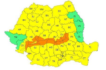 Pentru acelaşi interval a fost emisă şi o avertizare Cod portocaliu de intensificări susţinute ale vântului şi zăpadă viscolită în zona înaltă a Carpaţilor Meridionali şi de Curbură